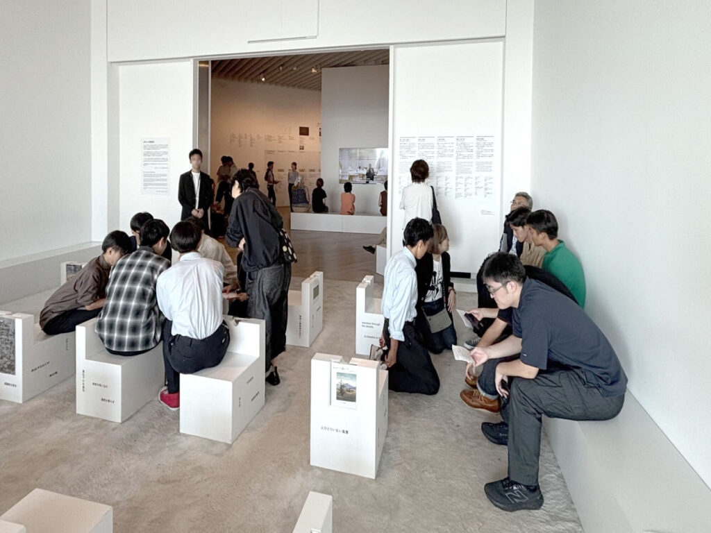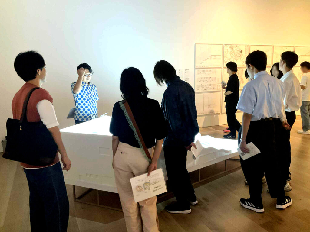 画面越しだった学生さん17名とユウキュウさんと私は初対面をはたし、ショートレクチャーやグループワークを行いました。藤本壮介さんの展覧会を楽しむには比較対象を持つなど、多少の予備知識は必要ですのでその準備を今までの中で行ってきましたが、さらに展覧会を楽しむにあたり「藤本建築のなにが新しいのか?」などいくつかの切り口を書いたカードを持って学生さんには展覧会に挑んでもらいました。ユウキュウさんと対話を鑑賞途中に何度も繰り返しながら、2.5時間の美術館滞在を終えました。